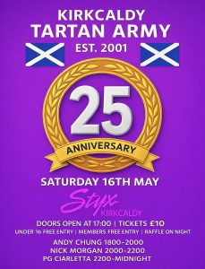 Kirkcaldy Tartan Army are hosting a special night to celebrate their 25th Anniversary. There will be a night of music with Andy Chung, Nick Morgan and PG Ciarletta. This will also be a get together before Scotland’s World Cup journey begins.